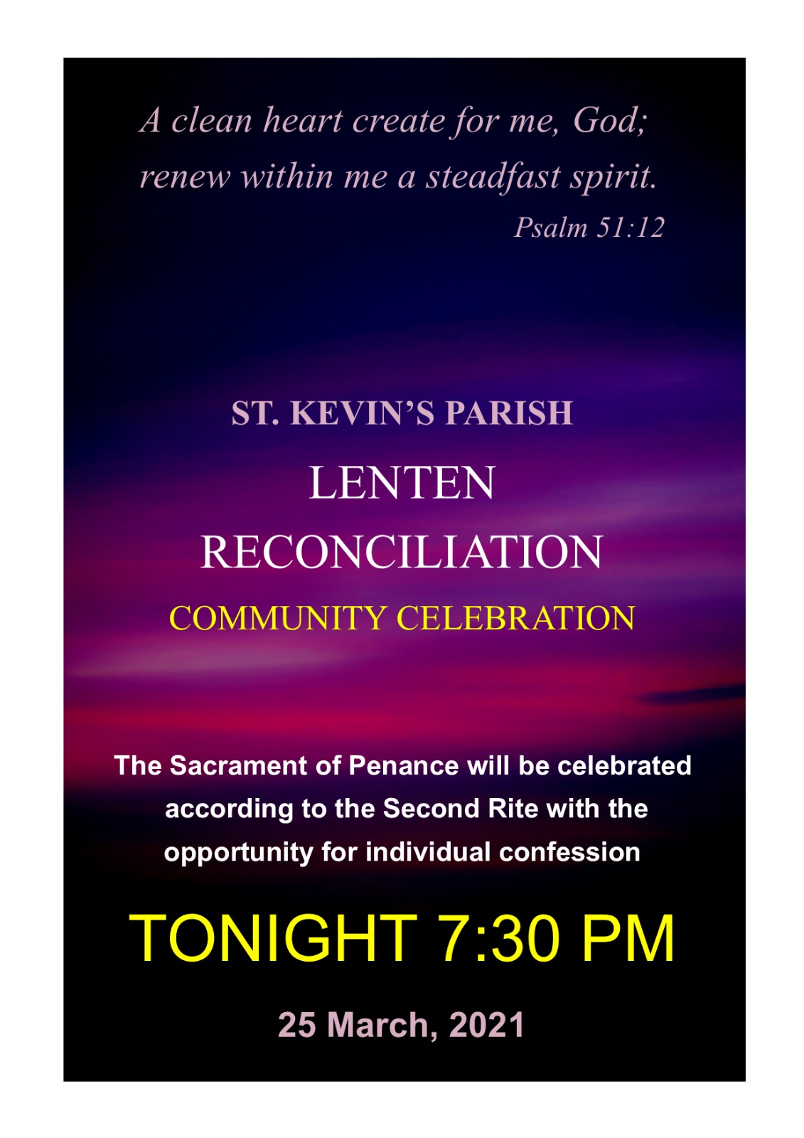 Lenten Reconciliation Community Celebration @7:30 PM on 25th March 2021 Share this: Click to email a link to a friend (Opens in new window) Email Click to print (Opens in new window) Print TweetLike Loading... Related