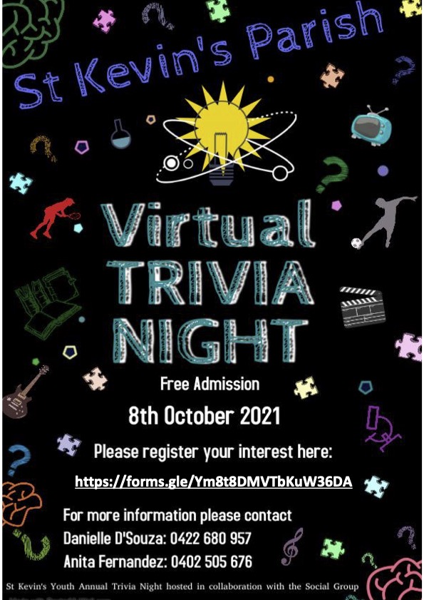 Hi everyone, we will be hosting a Parish trivia night on Friday the 8th of October at 7:30 pm. Admission is free! Please come along to have some fun and test your knowledge π