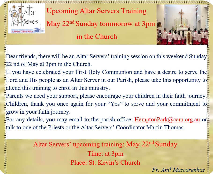 Altar Servers Training Session @ 3 PM on Sun 22nd May Share this: Click to email a link to a friend (Opens in new window) Email Click to print (Opens in new window) Print TweetLike Loading... Related