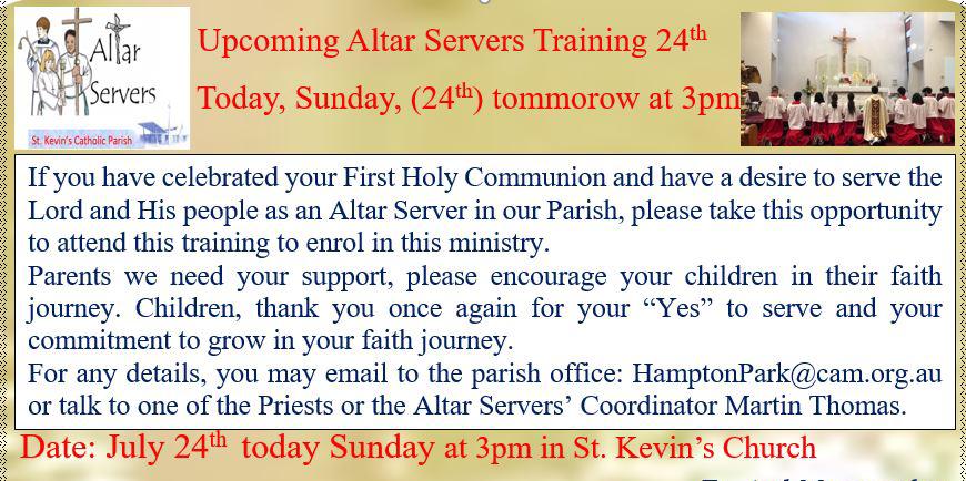 Reminder: Altar Servers Training Session being held in the church on Sunday 24th Jul @ 3 PM Share this: Click to email a link to a friend (Opens in new window) Email Click to print (Opens in new window) Print TweetLike Loading... Related