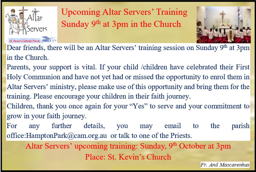 Altar Server’s Training Session on Sunday 9th Oct at 3 PM in the church Share this: Click to email a link to a friend (Opens in new window) Email Click to print (Opens in new window) Print TweetLike Loading... Related