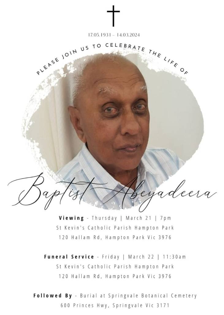 Obituary: Baptist Abeyadeera Share this: Click to email a link to a friend (Opens in new window) Email Click to print (Opens in new window) Print TweetLike Loading... Related