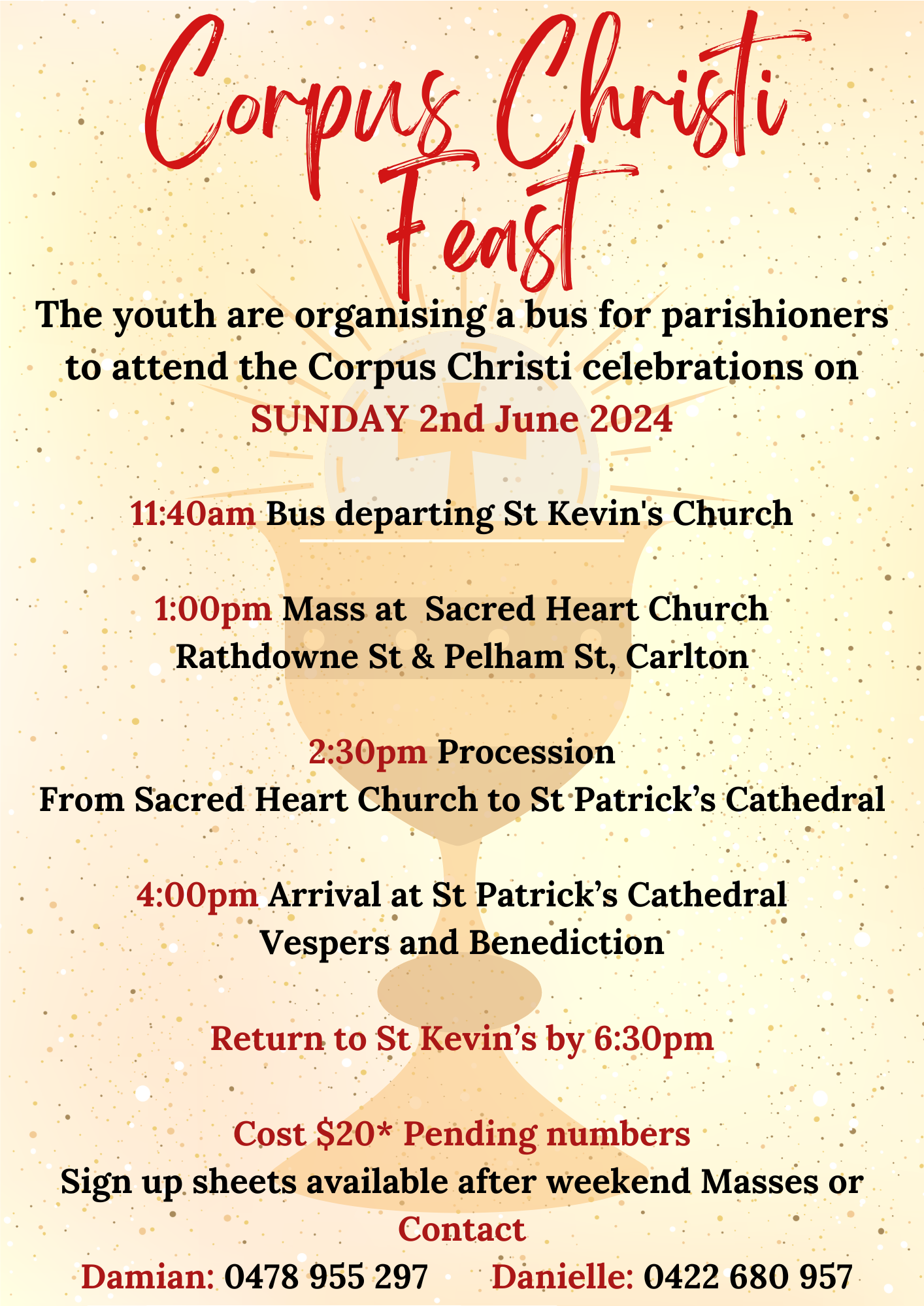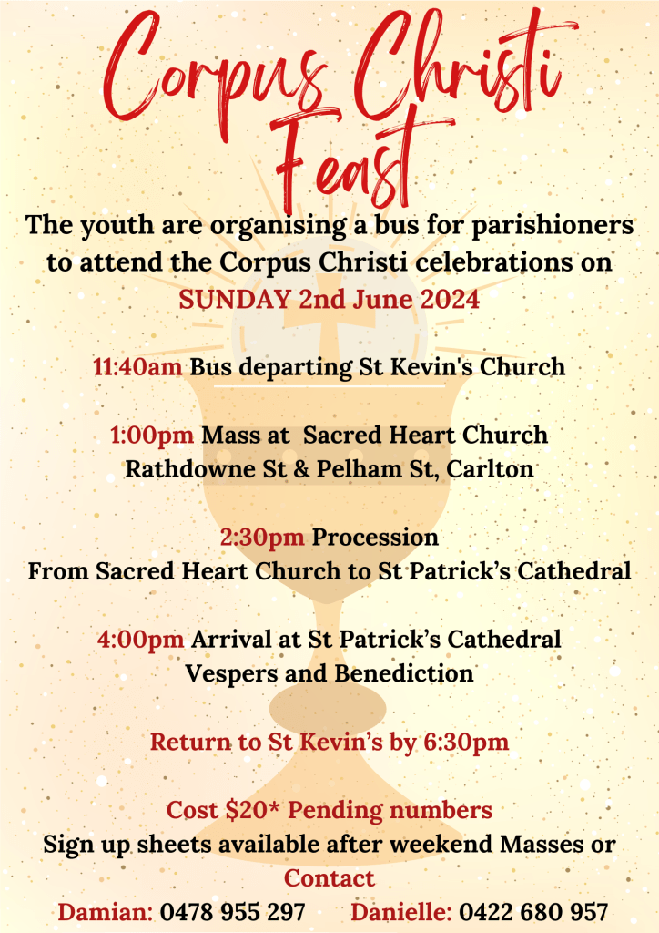 Bus being organised for Corpus Christi Feast Share this: Click to email a link to a friend (Opens in new window) Email Click to print (Opens in new window) Print TweetLike Loading... Related