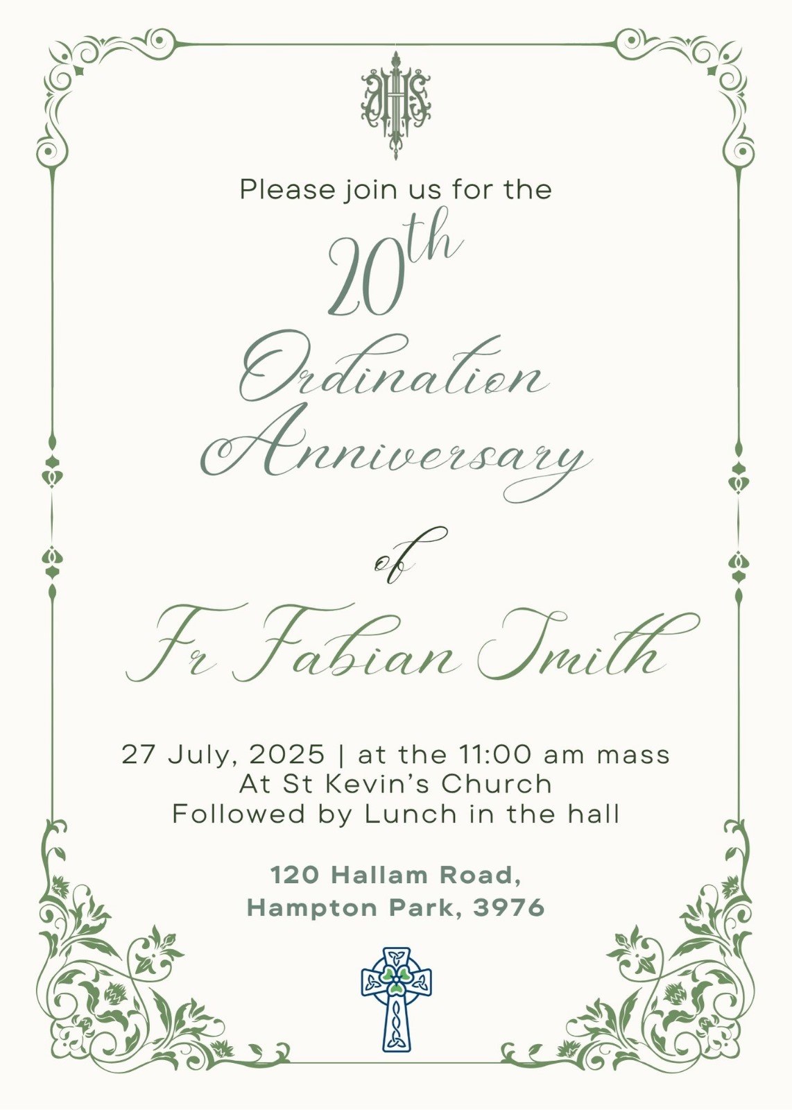 You are warmly invited to join us in honouring Fr Fabian on the occasion of his 20th Priestly Ordination Anniversary Mass of Thanksgiving Sunday, 27th July, 11:00 AM Followed by a celebratory lunch in the School Hall https://stkevins.org.au/wp-content/uploads/2025/07/frfabian-20anniversary.jpg